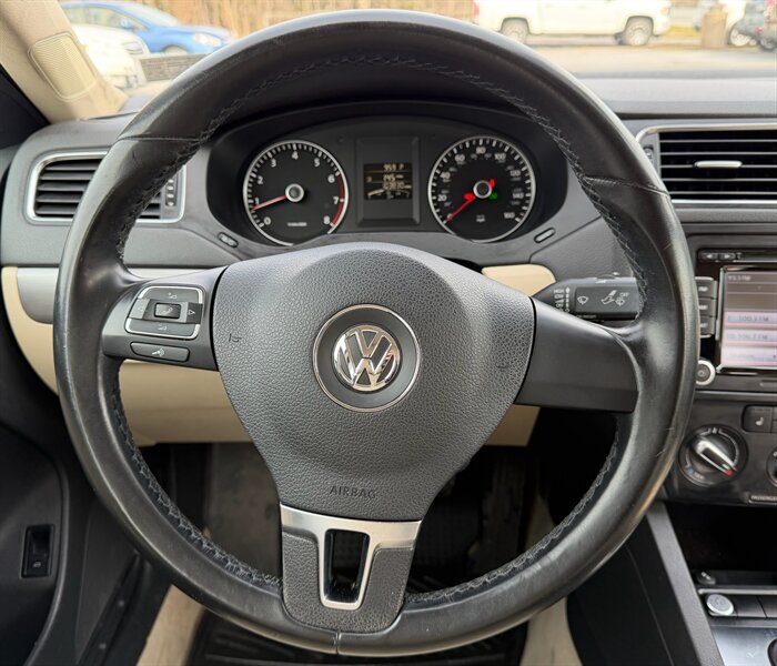 2013 Volkswagen Jetta SEL PZEV — Black Uni exterior, Cornsilk Beige interior. Powered by the factory 2.5L inline-5 PZEV engine producing 170 hp and 177 lb-ft of torque. This example has excellent overall condition, a clean CARFAX report, and well-maintained mileage below 104,000 miles (averaging under 8,000 miles per year). EPA fuel economy is approximately 24 MPG city and 31 MPG highway.